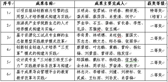 近日,福建省教育厅公布2020年高等教育省级教学成果奖获奖项目,我校共有6项成果获奖,其中《以项目驱动创新班为引擎的应用型人才培养模式构建与实践》获特等奖培育项目,《旅游类产业学院新生态的人才培养模式构建与实施》获一等奖,《基于资源化工试点专业群的生态智慧型实践教学模式改革》等4项成果获二等奖。此次获奖成果是我校有序推进转型发展,创新应用型人才培养模式、深化产教融合校企合作、提升学生实践创新能力,提高教育教学质量取得的丰硕成果。获奖数量位列全省同类高校前列。
