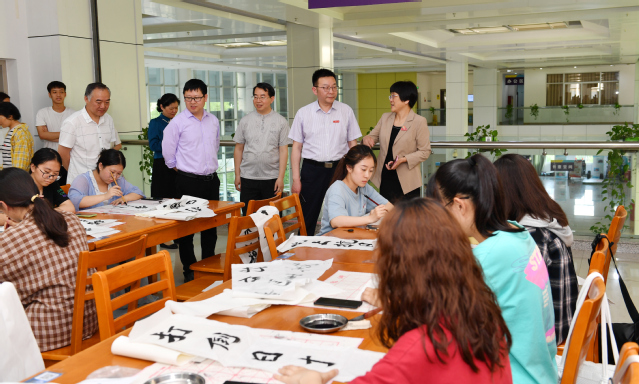 随后,廖景榕副书记、相关部门负责人及师生在图书馆北二阅览区观看校书法协会50余名师生的红色标语书写,在图书馆北一展厅观看“奋斗百年路 启航新征程”百年党史图片展。