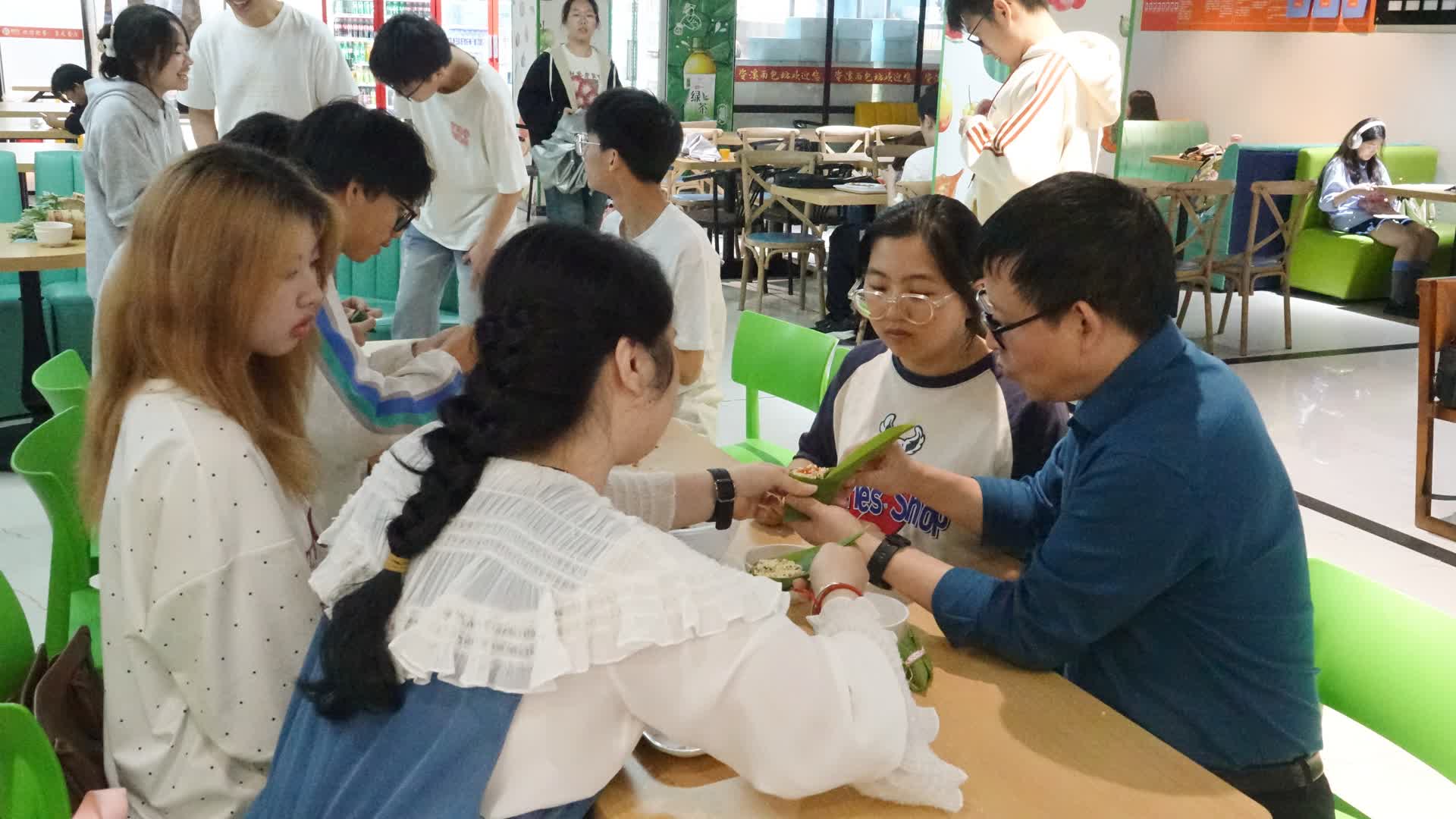 活动现场精心设置了五大主题体验区。雅乐品茗区以古琴雅乐、茶艺展示营造诗意氛围;艾墨传福区以粽叶为纸书写端午祝福;囊纳五瑞区、蒲艾盈馨区将民俗与创意结合,供师生制作香囊、艾草花束。最热闹的粽意工坊区里,师生在食堂师傅指导下,热情体验包粽子乐趣,在动手实践中感受节日温情与文化传承。
