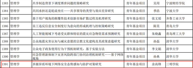 日前,2020年度教育部人文社会科学研究项目评审结果已公示,我校余高锋老师申报的《多源异质环境下网络安全态势感知与防护对策研究》,获得2020年教育部人文社会科学研究青年基金项目立项(拟资助经费8万元)。 截至2020年,我校共承担完成和在研教育部人文社会科学一般项目6项。
