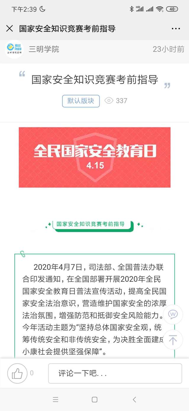 4月15日是第五个全民国家安全教育日,疫情防控期间机电工程学院根据学校要求,机电工程学院通过线上宣传阵地,采用网络化、无接触、群众性的宣传形式,推出国家安全教育系列活动。