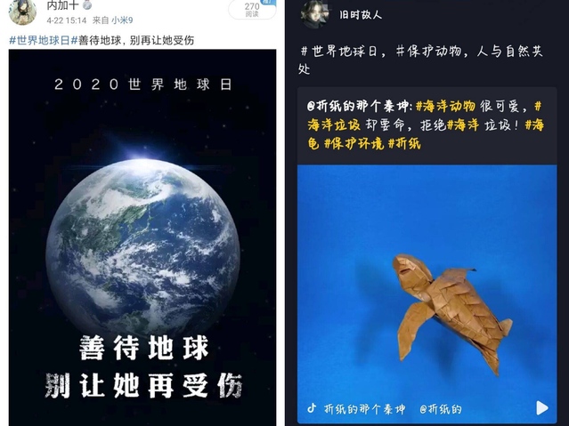地球孕育万物生灵,是大家赖以生存的家园。受疫情影响,此次的宣传活动在线上进行,活动内容丰富,有通过朋友圈、微博等社交平台线上交流,也有地球故事短视频拍摄宣传。在线上宣传交流上,同学们在社交平台上发出一些有关世界地球日的故事或话题,引来了大家同学关注,同学们纷纷在话题下评论和转发。而有的同学以照片的形式,晒出在日常生活中保护地球的举措,和呼吁大家保护环境,健康生活,爱护地球。在此次的疫情中,许多捕杀并食用野生动物的事件被曝光,大家感触很深,也让大家明白了保护这些野生动物就是在保护人类自己。