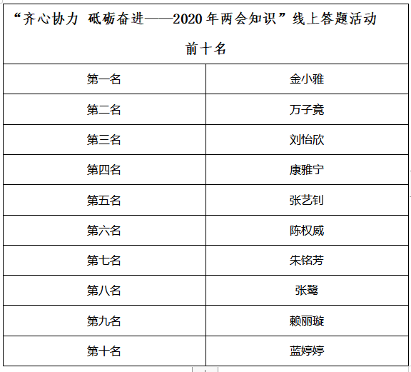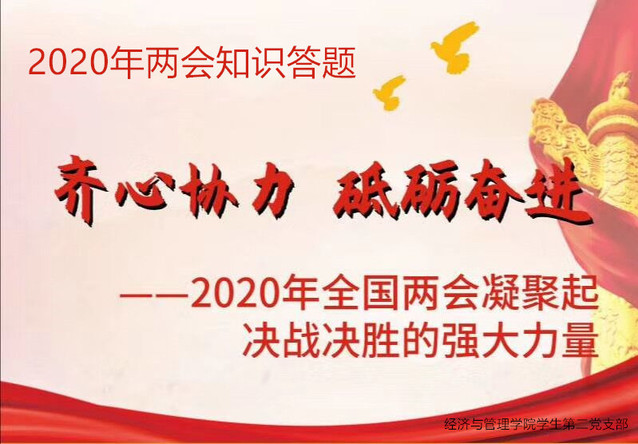 2020年6月3日,yl6809永利官网经济与管理学院学生第二党支部通过微信问卷星小程序开展“齐心协力 砥砺奋进——2020年两会知识”线上答题活动。此次答题活动旨在“以赛促练、以赛促学、以赛促进”,帮助支部成员检验理论学习成果,从而推动2020年两会精神学习向纵深推进。参与答题活动的有党员、积极分子共133人次。金小雅、万子竟、刘怡欣等同志获得答题活动前十名。