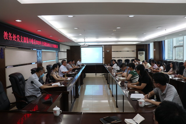 6月15日下午,教务处党支部在行政楼四楼会议室集中收看2020年全国高教处长会暨高等学校教学指导委员会工作视频会议。校党委委员、副校长张君诚,教务处全体党员参加视频会议。