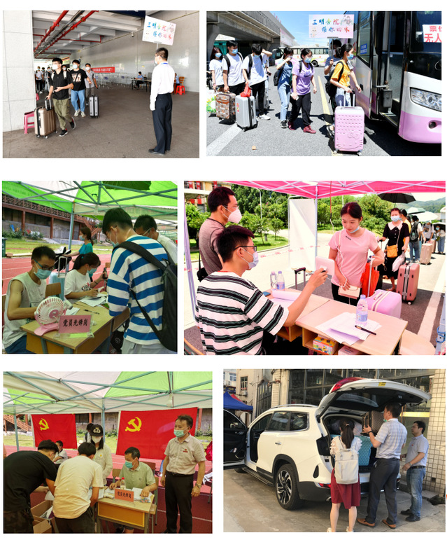 经过月余的摸底研判、统筹部署、实地演练,当日清晨,党员先锋岗党员们准时在各自服务点就位严阵以待,各流程分工明确,细致周到。“yl6809永利官网接你回家”一句问候从机场、车站接待点延续至校园,教师党员志愿者们细心做好返校同学的登记,调度校车完成点到点接送到校。校园接待点的教师党员志愿者详细告知返校毕业手续办理流程,暖心嘱咐同学们戴好口罩、按时测温,做好个人防护。餐厅秩序岗位上,为毕业生们搭起了长长的帐篷走廊,保持一米以上的用餐“长龙”也能避免烈日侵袭。