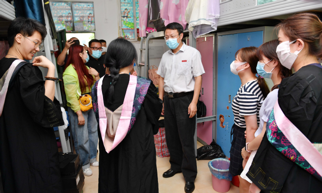 返校日,同学们陆续抵达校门,有序排队,按指定的进校通道经过人脸识别、口罩更换、洗手消毒、体温检测、查验健康码等环节,欣喜地进入了思念已久的校园。校领导和相关部门负责人到校门口迎接,并与学生亲切交谈,给每位毕业生带去久违的问候。期间,校领导率相关部门负责人全面进行校园安全巡查,走进宿舍关心慰问返校学生。