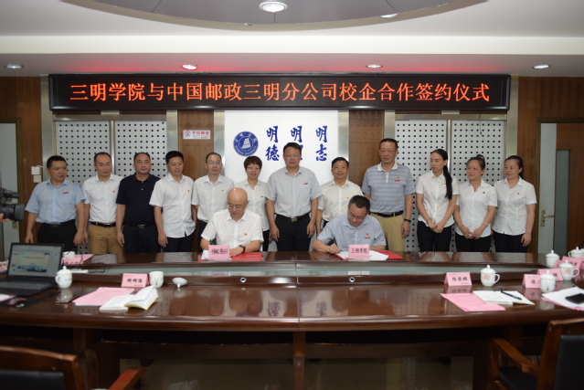 6月30日下午,我校与中国邮政集团三明分公司合作签约仪式在行政楼五楼会议室举行。中国邮政集团三明分公司党委书记、总经理黄汉榕、党委委员、副总经理等一行9人出席仪式,校领导潘玉腾、赖锦隆及相关单位负责人参加仪式。机关党委陈荣辉书记主持仪式。