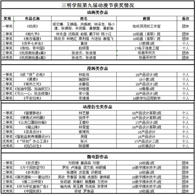 经过评委们的认真评审,最终来自动妖灵灵妖工作室的王锦强等人凭借作品《抗疫》摘得动画作品类一等奖、2016级产品设计专业的林能伟凭借作品《战疫必胜》摘得漫画类一等奖、2016级产品设计(高职)专业的林艺慧凭借作品《智慧脉动》摘得动漫衍生品类一等奖、2016级动画(媒体创意)专业的刘莉媛等人凭借《安贞堡》摘得微电影类一等奖。