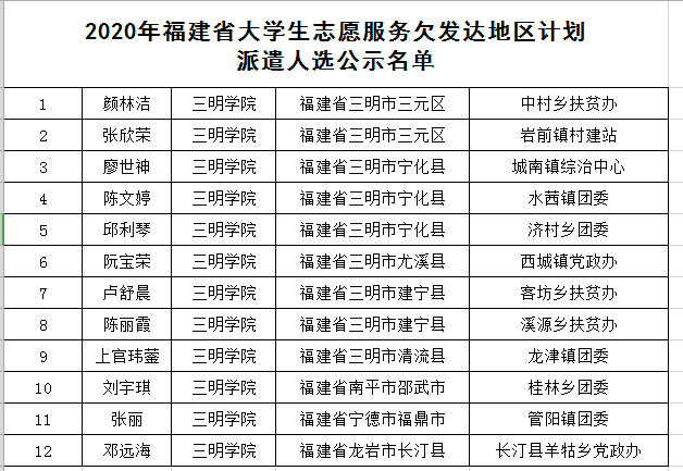 7月15日,2020年福建省大学生志愿服务欠发达地区计划派遣人选公示名单发布,我校共有12位学生录选,其中派遣三明9人,南平1人,宁德1人,龙岩1人,录取和留明就业人数较往年取得新突破,共青团助力毕业生就业工作取得新进展。