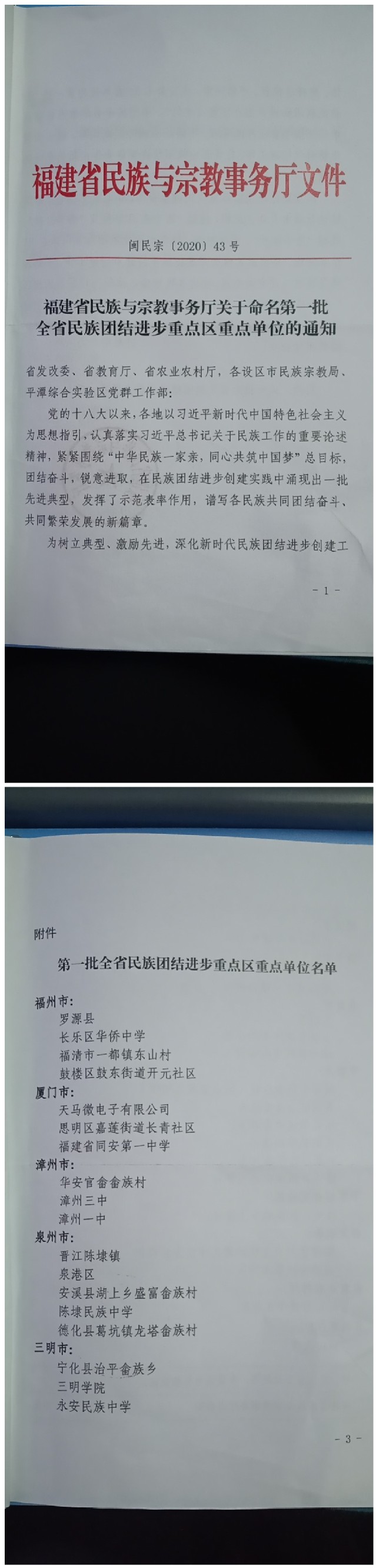 日前,福建省民族与宗教事务厅发布《福建省民族与宗教事务厅关于命名第一批全省民族团结进步重点区重点单位的通知》(闽民宗〔2020〕43号),经择优推荐、严格评审,我校被正式命名为“第一批全省民族团结进步重点单位”。
