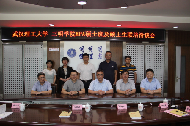7月28日上午,武汉理工大学马克思主义学院院长朱喆、副院长权宗田、学院社会服务及培训(MPA)中心副主任彭攀、陈文安一行赴我校洽谈合作办学事宜,洽谈会在行政楼五楼会议室举行,副校长张君诚,教务处、马克思主义学院负责人参加会议。