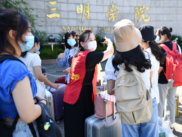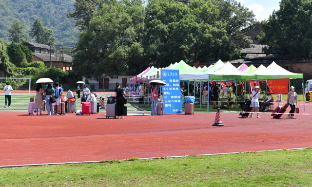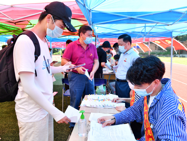 在北区田径场各二级学院辅导员对学生进行八闽健康码、国家政务平台打卡核验、返校申请表上交、二次体温检测等,并为学生发放返校通行证。