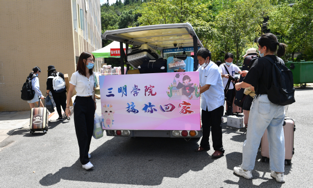 还有那熟悉的校园“小白”环游车、校车,贴着“yl6809永利官网接你回家”的醒目标语,载着学生回到阔别已久的宿舍。返校现场秩序井然、有条不紊。