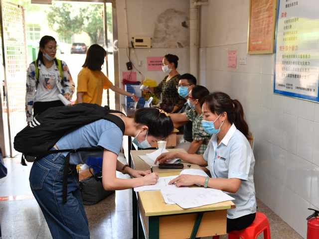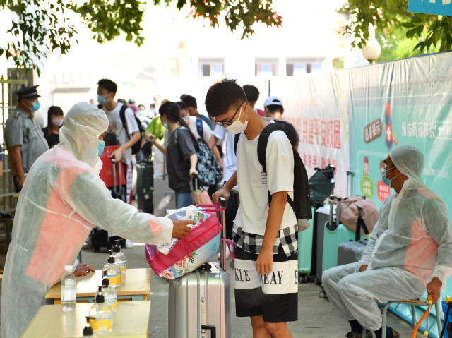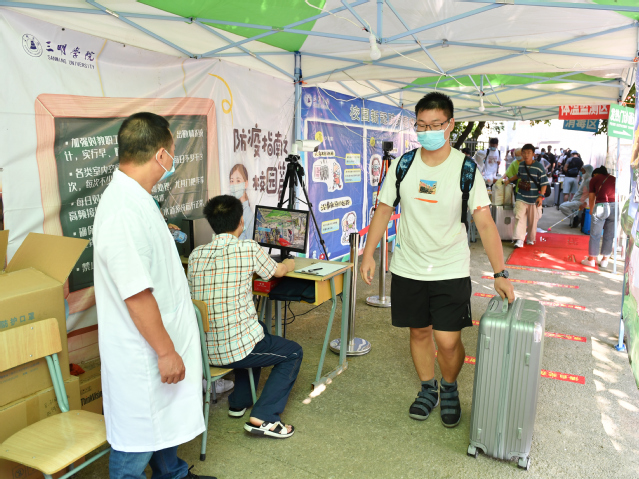 返校首日,校门口、北区田径场、宿舍楼等地设置服务点。在北区校门口,学工部、保卫处、后勤管理处、校医院、网络中心的工作人员对每一位学生进行人脸识别、体温检测、行李消毒、口罩更换。