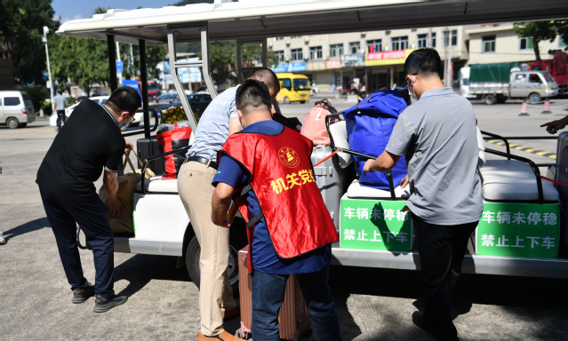 看到学生行李多且重,机关党委也紧急抽调党员志愿者支援北区校门值班岗位,在烈日中引导人车分离维持安全秩序,帮助学生们保管托运大件行李,彰显党员先锋模范作用,以热情细致的服务欢迎学子回家。
