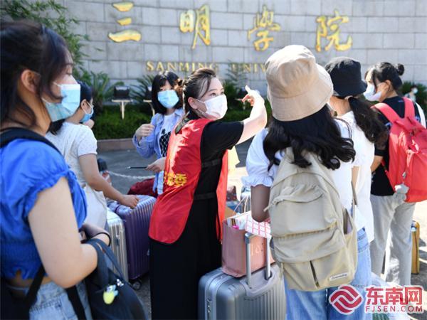 返校首日,校门口、北区田径场、宿舍楼等地设置服务点。在北区校门口,工作人员对每一位学生进行人脸识别、体温检测、行李消毒、口罩更换。在北区田径场,各二级学院辅导员对学生进行八闽健康码、国家政务平台打卡核验等,并为学生发放返校通行证。