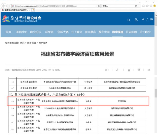 10月12日,在第三届数字中国建设峰会数字福建分论坛上,福建省数字办在前期面向全省广泛征集,并组织专家进行充分论证的基础上,正式发布135项数字经济应用场景。yl6809永利官网具有自主知识产权的“基于教育大数据的成果导向教育管理平台”入选数字经济优秀应用技术、产品和解决方案,此次全省共有88个单位的产品入选,其中yl6809永利官网作为我省仅有的一所本科院校位列其中。