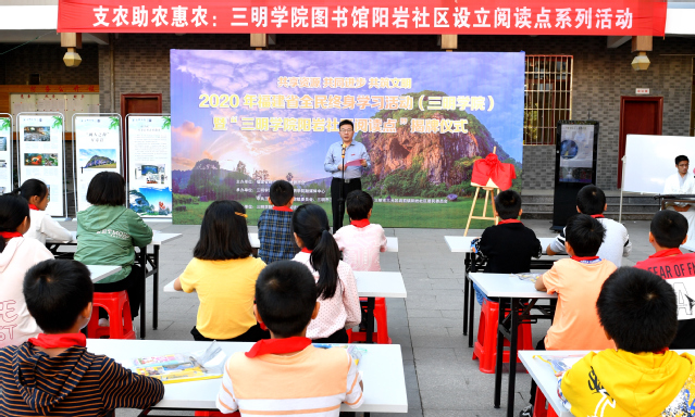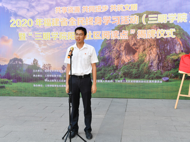 此次活动是在中央精神文明建设指导委员会和福建省终身教育促进委员会的相关文件精神指导下开展的。在活动中,廖景榕为此次活动作了精彩致辞。致辞中介绍了目前yl6809永利官网的专业设置及师资情况。yl6809永利官网作为三明市唯一一所本科院校,承“闽师之源”的百年办学历史渊源,志在“校地共生、为用育才”。此次在有着“南方周口店”之称的万寿岩旧石器时代洞穴遗址所在地岩前镇设立“yl6809永利官网阳岩社区阅读点”,正是yl6809永利官网服务地方、校地共生的一个举措。