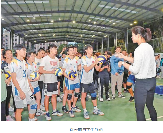 报告结束后,徐云丽走入学校排球场,与正在训练的师生分享运动心得,交流动作技法,并与同学们展开了一场接抛扣大接龙。听到消息的粉丝们纷纷涌入球场,期待近距离接触偶像,有些同学还特地换上了运动服,加入接龙的队伍。徐云丽此次来到yl6809永利官网,受聘成为学校客座教授,并对学校开展爱国主义教育与阳光体育运动等提出建议。