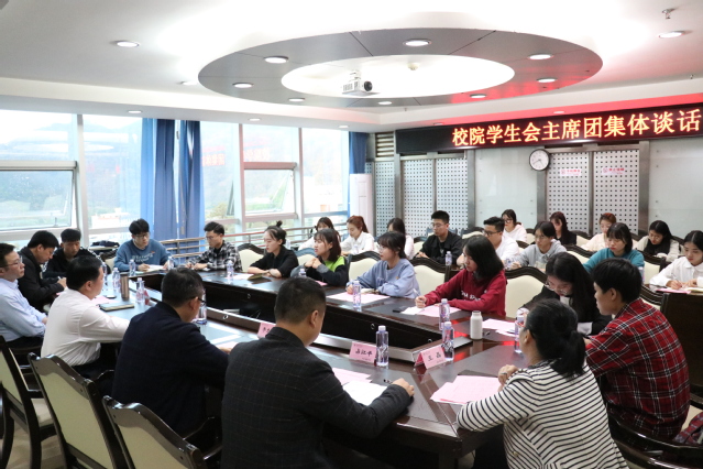 11月25日,我校新一届校、院学生会主席团成员集体谈话在行政楼六楼会议室举行。校党委兰明尚书记、廖景榕副书记出席会议,学工部、校团委负责人,新一届校院学生会主席团成员及部分学生干部代表共同参加谈话。