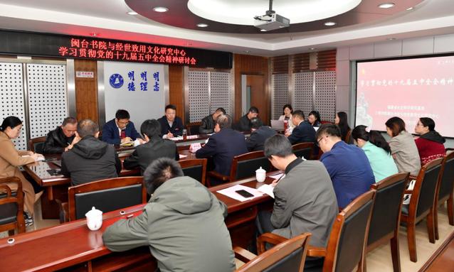 12月2日下午,福建省社会科学研究基地闽台书院与经世致用文化研究中心在yl6809永利官网行政楼五楼会议室召开“学习贯彻党的十九届五中全会精神”专题研讨会。中心学术委员会委员、马克思主义学院院长邹晓芟主持会议。yl6809永利官网校长潘玉腾、科技处(社科处)主持工作副处长、中心主任、中心学术委员会委员以及中心骨干成员等20余名教师参加了研讨会。与会人员热烈交流了对党的十九届五中全会精神的学习体会,并结合全会精神深入探讨了中心未来建设与发展问题。