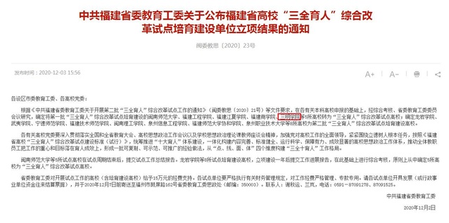日前,中共福建省委教育工委公布“三全育人”综合改革试点培育建设单位立项结果,确定yl6809永利官网转为福建省“三全育人”综合改革试点高校。