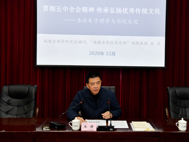 12月16日上午,校党委理论学习中心组扩大学习会在行政楼八楼会议室召开,邀请福建省闽学研究会顾问、“福建省高校思政课”特聘教授朱清作了题为《贯彻五中全会精神 传承弘扬优秀传统文化——刍论朱子理学与书院文化》专题辅导报告,校领导赖锦隆、廖景榕、张君诚、詹学齐到场学习。