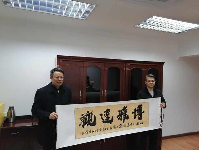 向陈出新先生赠送全国书法家协会会员、我校书法教师连长生副教授书写的“博雅达观”书法
