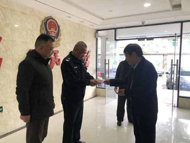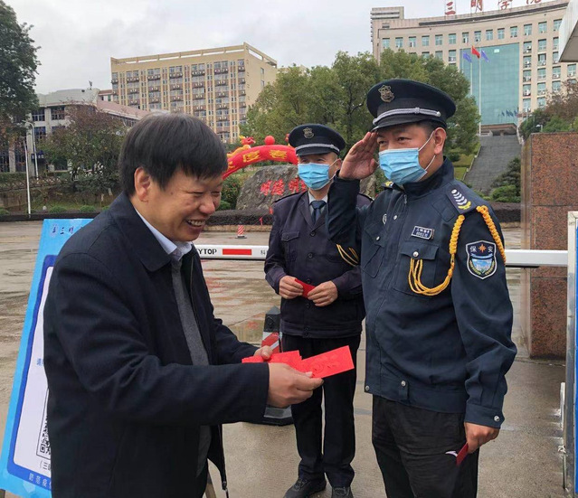 2月11日上午,副校长谢松明带队亲切慰问除夕坚守在一线值班的荆东派出所民警与各岗点保安,向他们致以节日的问候,并送去学校亲切关怀和新春祝福。