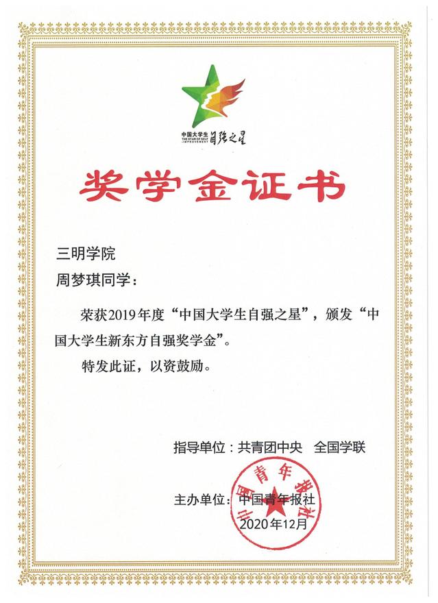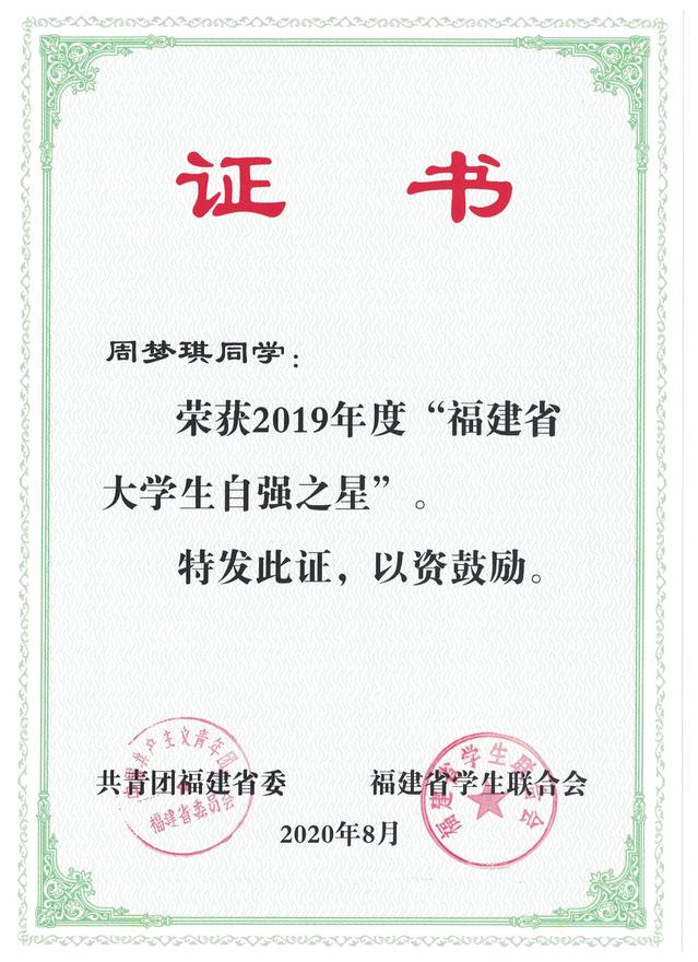 由共青团中央、全国学联共同组织开展的2019年度寻访“中国大学生自强之星”活动结果揭晓,我校周梦琪同学荣获“中国大学生自强之星”称号,获颁“中国大学生新东方自强奖学金”,同时获得2019年度“福建省大学生自强之星”称号。