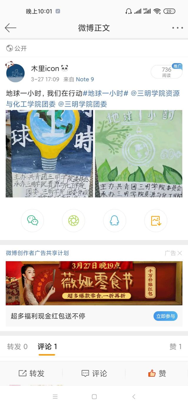 活动的准备工作进行的有条不紊。协会成员在活动的前一天便积极进行宣传,结合线上线下的形式充分让同学们了解关注此次活动。活动过程中,通过现场讲解、与宣传画合照、进行朋友圈微博话题分享等方式让同学们参与到“地球一小时”活动中,参与活动的同学将“地球一小时”相关宣传内容转发至各大社交平台,即可领取精美小礼品。同学们自觉、积极参与“关灯一小时”活动,活动当晚,广大同学纷纷响应号召,自觉熄灯一小时,活动取得圆满成功。