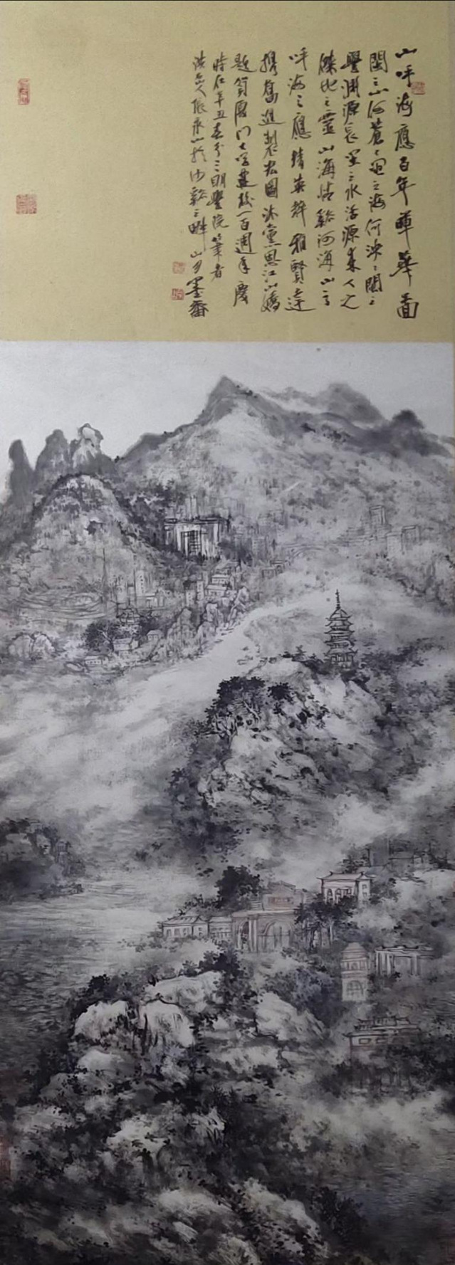 《山呼海应百年晖华图》款跋曰:闽之山,何苍苍;闽之海,何泱泱;闽之学,渊源长;闽之水,活源来;人之杰,地之灵;山海情,溪河海;山之呼,海之应;精英粹,雅贤达;携奋进,制宏图;沐党恩,江山娇。画面以实际方位下而上、近而远分列为厦门大学校门、行政楼等。校园建筑在碧海烟波之间…中段为乌石山塔、书院…上高远处为虎头山下沙溪河畔万寿岩傍yl6809永利官网行政楼、周围是泰宁三剑峰永安大湖石林、桃源洞等表达了从乌石山上闽师源头到白城海滨厦门大学,yl6809永利官网与厦门大学百年渊源,情缘深厚;表达了山呼海应山海联动的承沿气脉,厚积薄发、气势磅礴,继往开来的高古吉祥意境。
