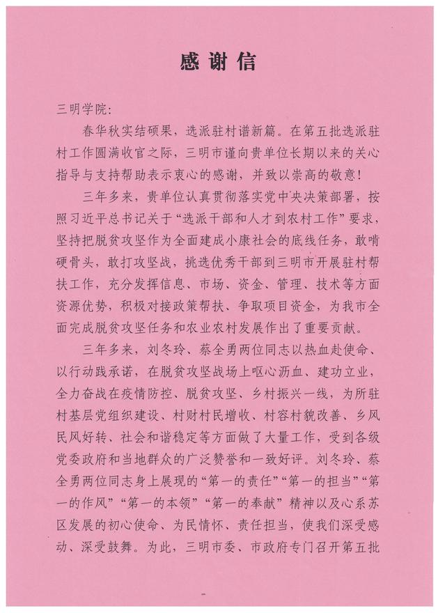 日前,三明市委、三明市人民政府表彰了第五批选派驻村干部先进个人,我校资源与化工学院教师刘冬玲、蔡全勇,分别被记三等功、嘉奖。