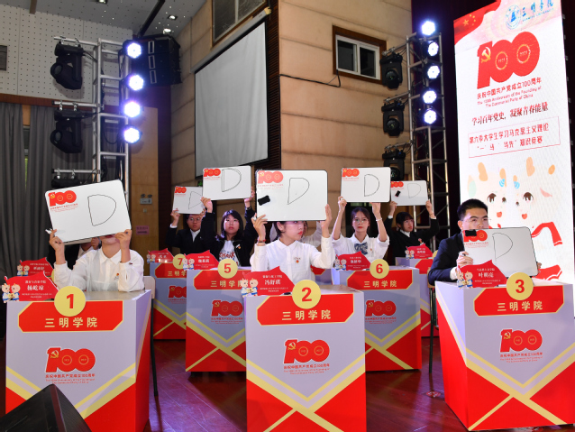 总决赛以中共百年党史、福建红色文化历史、三明红色文化历史等为题库,选手们通过“个人必答”、“一站到底”和“现场互动”三个环节不断淘汰,现场气氛热烈而紧张。比赛过程中穿插了男生合唱《我宣誓》、女生合唱《天耀中华》和讲演《三明实践故事》等节目,将现场观众问答题目融合到了节目之中,形成了台上台下一体互动的氛围,观众反响十分热烈。经过近两个小时的激烈角逐,马克思主义学院、教育与音乐学院、海外学院(外国语学院)代表队分别夺得冠亚季军,比赛同时决出了个人一等奖1人,二等奖2人,三等奖3人。“紧张、激动、自豪!通过参加一‘马’当先知识竞赛,使我对党史有了更深入的了解,令我深刻地感受到了中国共产党的伟大和百年奋斗征程中的不朽成就。”比赛一等奖获得者文化传播学院2019级汉语言文学专业学生叶明亮赛后激动的说。