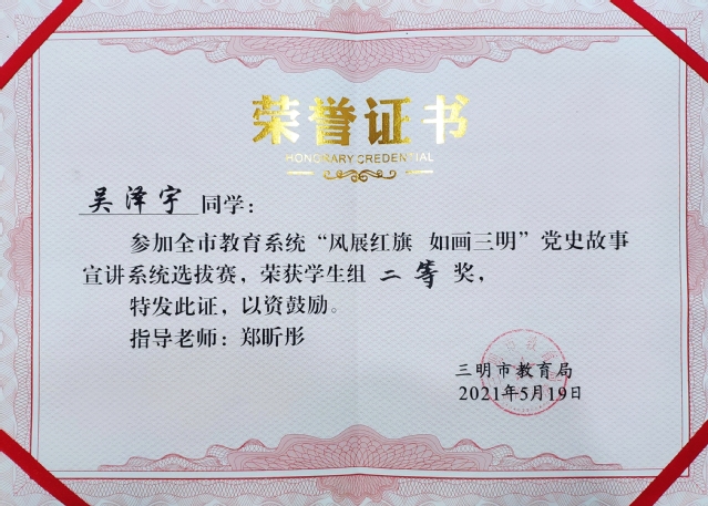 5月19日,三明市教育系统“风展红旗 如画三明”党史故事宣讲选拔赛在三明市艺术馆落下帷幕。我校吴泽宇荣获学生组二等奖,王佳玉荣获教师组优秀奖。