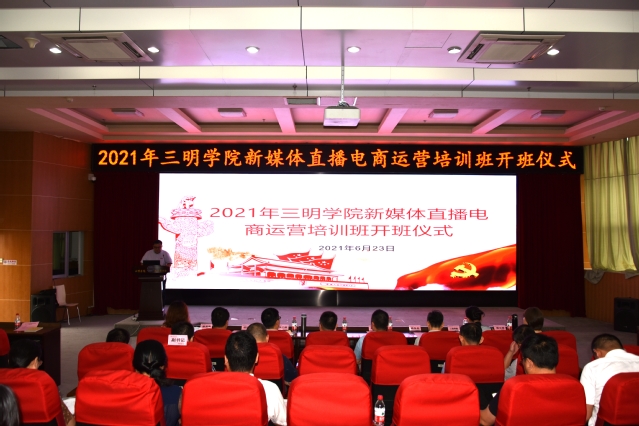 为热烈庆祝中国共产党成立100周年,切实将“学党史、悟思想、办实事、开新局”要求落到实处,6月23日下午,yl6809永利官网2021年新媒体直播电商运营培训班在图书馆学术报告厅隆重开班,校党委廖景榕副书记、福建富民云咖信息科技有限公司郑泉旺董事长、学工部、校团委、教务处、三创学院负责人、各二级学院师生参加开班仪式。