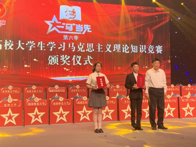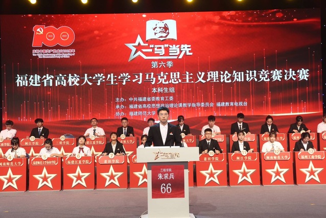 第六季福建省高校大学生学习马克思主义一“马”当先知识竞赛决赛内容紧紧围绕中国共产党百年党史、党史学习教育指定教材、福建红色文化历史等展开。现场分必答和淘汰两个环节,竞赛内容丰富,涉及知识面广,题目设置灵活新颖、紧跟时势。当被问及获奖感言时,朱求兵激动的说道:“兴奋、激动!值此中国共产党百年华诞之际,我很荣幸能够代表学校与来自全省本科高校优秀大学生同台竞技,为大家奉献了一场精彩的比赛,以昂扬上进的精神风貌,献礼中国共产党成立100周年。”