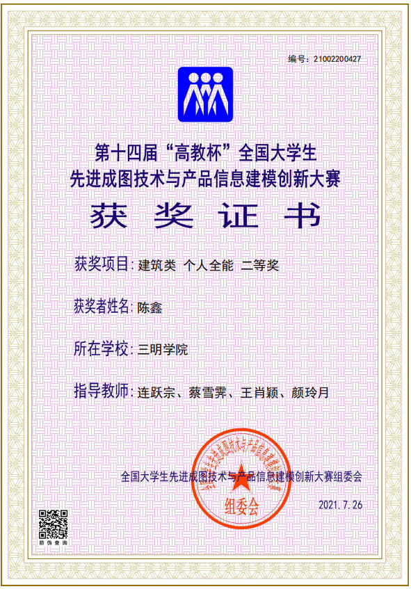 我校建筑工程学院成图大赛兴趣小组(指导老师:连跃宗、颜玲月、王肖颖、蔡雪霁等,第十四届备赛学生)充分利用课外与假期时间,强化大赛各项技能学习与训练;经过激烈角逐,最终获得国家级建筑类个人全能二等奖1项。