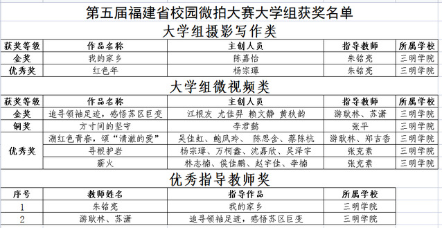 在大学组摄影写作类中,《我的家乡》荣获金奖,《红色年》获优秀奖;在大学组微视频类中,《追寻领袖足迹,感悟苏区巨变》荣获金奖,《方寸间的坚守》获铜奖,《溯红色青春,颂“清澈的爱”》、《寻根护岩》、《薪火》均获优秀奖。同时,朱铭亮、游耿林、苏潇三位老师获得优秀指导教师奖。