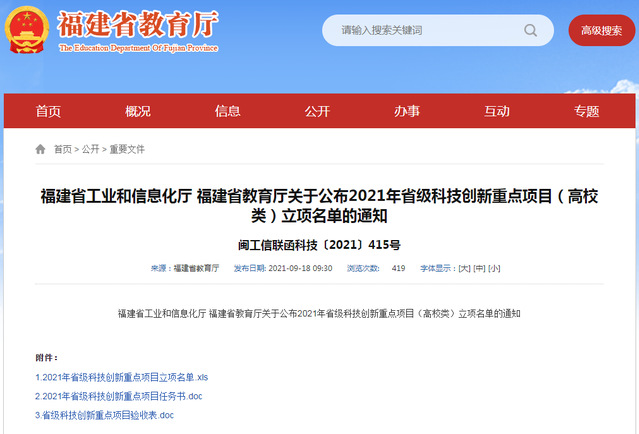 近日,福建省工业和信息化厅、福建省教育厅发布《关于公布2021年省级科技创新重点项目(高校类)立项名单的通知》,我校获立项4项,其中省级资助2项、经费自筹2项,省级资助项目数居于全省高校前二。