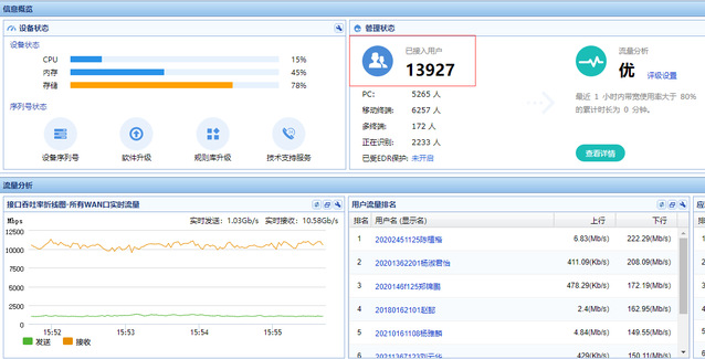 为进一步减少疫情对教学活动的影响,网络中心系统部署了疫情防控期间线上教学网络保障工作,制定了《yl6809永利官网新型冠状病毒肺炎疫情线上教学工作实施的保障方案》保障工作实施方案。成立党员先锋岗,深入各个部门调研、深入学生宿舍解决网络故障问题,每天安排技术人员值班;提前升级出口带宽,要求运营商在疫情重点保障学校带宽,目前,我校网络出口流量稳步提升、时延低、无拥塞,终端平均速率稳定无卡顿,为线上教学工作提供全面保障。