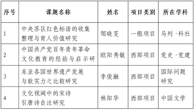 9月24日,全国哲学社会科学工作办公室公布2021年度国家社科基金项目立项结果,我校4项课题获得立项,其中一般项目1项、西部项目3项,创历史最好成绩,居省内同类高校前列。
