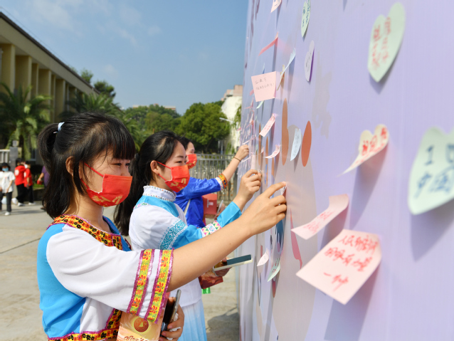 “盛世华诞,爱我中华”、“我爱你中国,始终如一,永远坚定”、“祝愿祖国繁荣昌盛、国泰民安”……10月1日,“心之所向”国庆专题系列活动之青春告白祖国在南区田径场门口举办,师生们在便利贴上写下了自己对祖国的真诚祝福,用自己的青春誓言告白祖国。