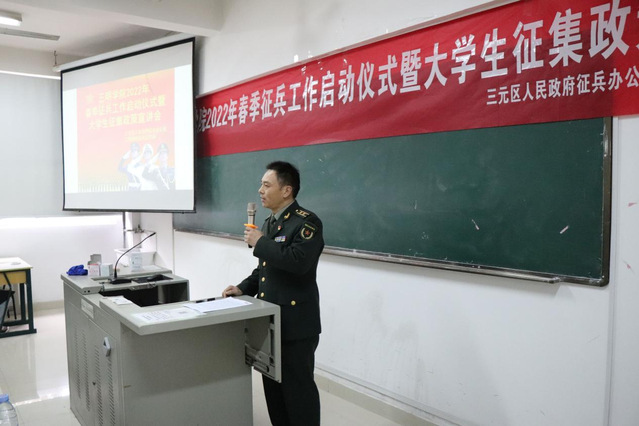 12月23日,yl6809永利官网2022年春季征兵工作启动仪式暨征集政策宣讲会在博学楼209教室顺利召开。三元区武装部副部长付振江、学校武装部负责人和相关工作人员参加了活动。