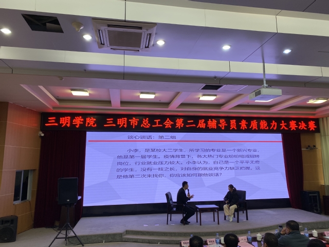 学党百年史,为党育新人!为进一步促进辅导员队伍专业化、职业化、专家化发展。12月28日上午,yl6809永利官网、三明市总工会第二届辅导员素质能力大赛在yl6809永利官网图书馆报告厅举行。三明市总工会张素梅副主席、yl6809永利官网党委廖景榕副书记出席本次大赛。三明市总工会经技部,yl6809永利官网组织部、学工部、校团委、校工会相关负责人、各二级学院党委副书记、全体辅导员到场观摩比赛。