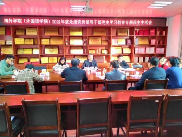 1月6日下午,海外学院(外国语学院)召开2021年度处级党员领导干部党史学习教育专题民主生活会,校党委委员、副校长林建伟莅临指导,校党委组织部、纪检监察室有关人员陪同参加。