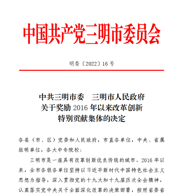 近日,中共三明市委、三明市人民政府发布《关于奖励2016年以来改革创新特别贡献集体的决定》,yl6809永利官网创新创业创造学院“创新创业教育改革”荣获“改革创新特别贡献集体嘉奖”,成为学校首个获得三明市委、市政府嘉奖的单位。
