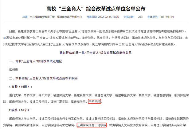 日前,福建省委教育工委发布《关于公布高校“三全育人”综合改革第一批试点总结评估和第二批试点培育建设高校中期考核结果的通知》。yl6809永利官网、yl6809永利官网信息工程学院分别顺利通过第一批高校“三全育人”综合改革试点高校和院系总结评估。