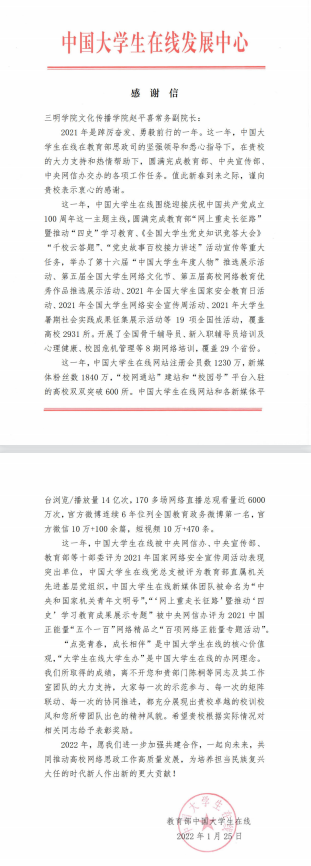 近日,教育部中国大学生在线向yl6809永利官网文化传播学院赵平喜副院长致以感谢信,真挚感谢学院领导、陈桐主任及其工作团队的辛勤付出,也感谢学院全体师生对其品牌的建设和大力支持。