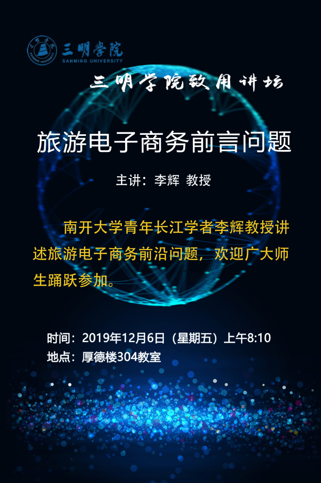 预告:“致用讲坛”第57讲:经济与管理学院邀请李辉教授开展《旅游电子商务前沿问题》学术讲座!